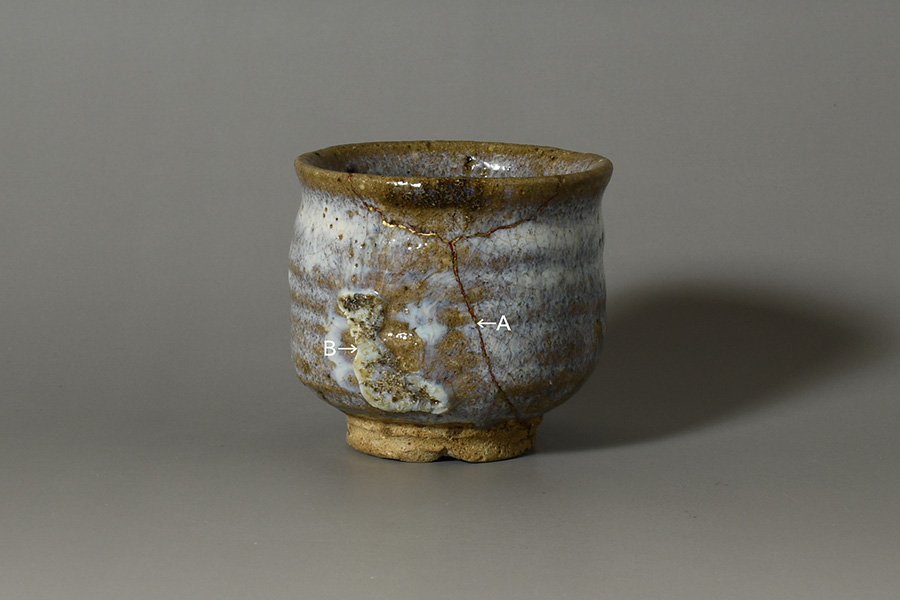 ※矢印Aの部分に金繕いが施され、矢印Bの部分に「釉溜まり」がありますが、それが個性ある景色を作り出しています。