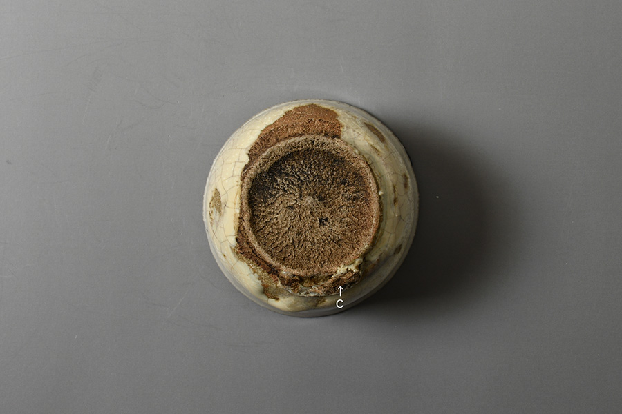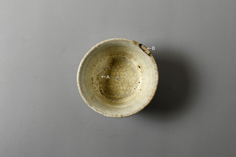 ※後世の大きな修理は見受けられず、時代相応の擦れと古色が備わった安定した状態です。見込みには細かな貫入が広がり、長年の使用と経年による柔らかな表情が現れています。口縁には窯中で生じた石ハゼ状の景色が見られ(矢印Bの部分)、見込みには胎土の盛り上がりと白濁の強い部分があります(矢印Aの部分)。高台際には焼成時のクッツキが見られます(矢印Cの部分))。けれども、いずれも窯変として全体の景色の中に自然に溶け込んでいます。