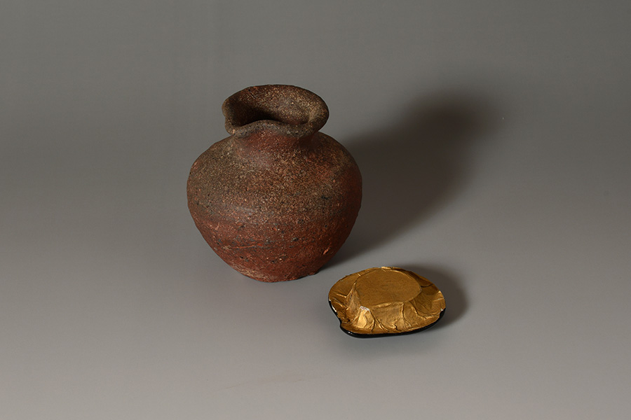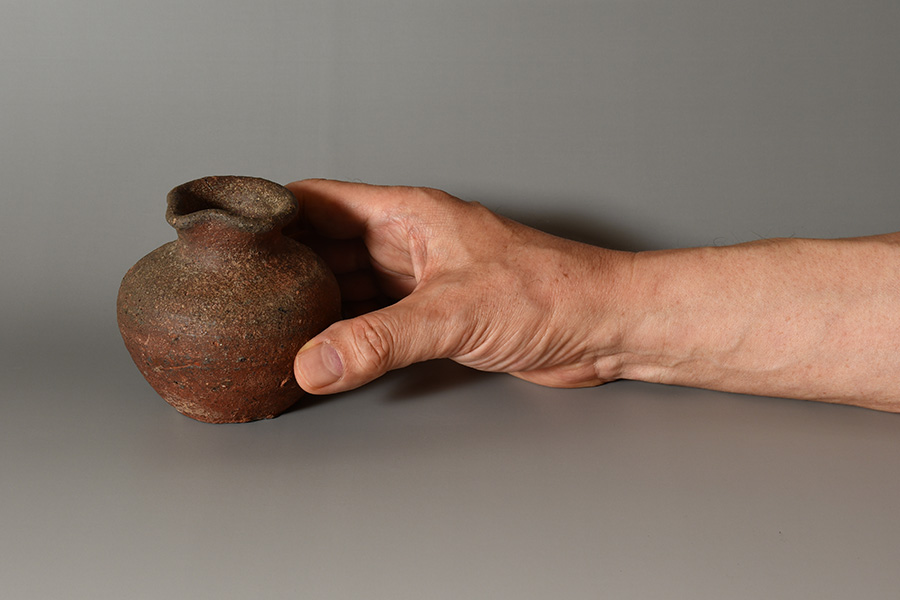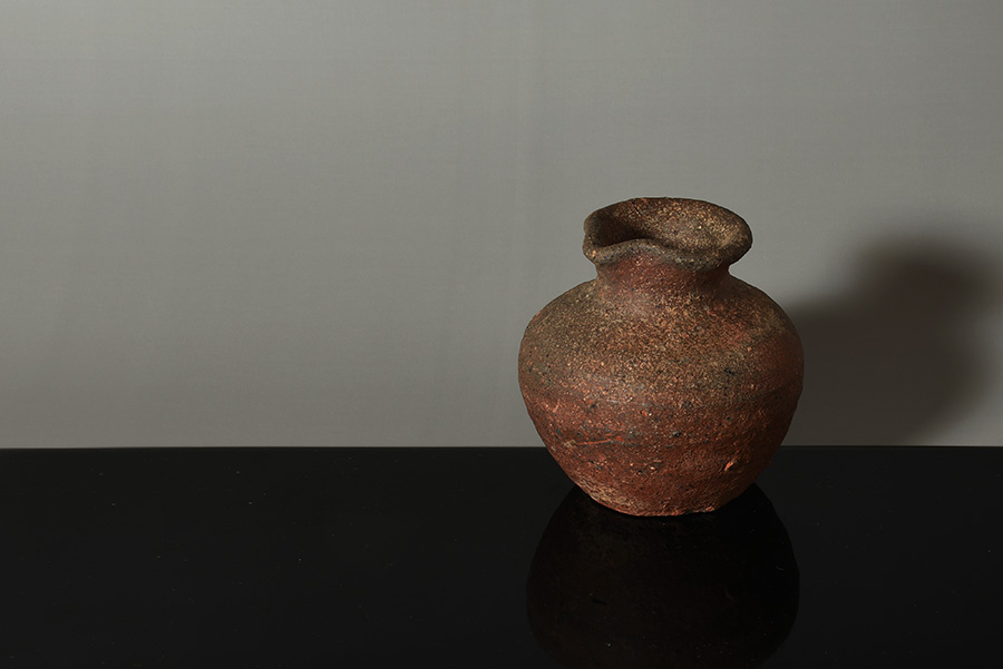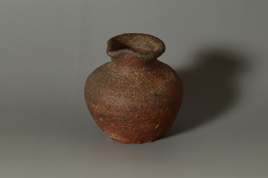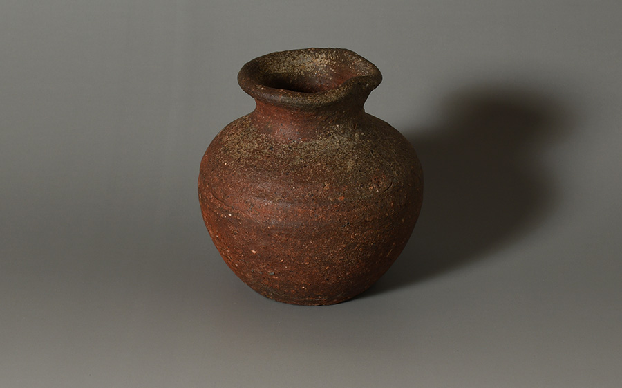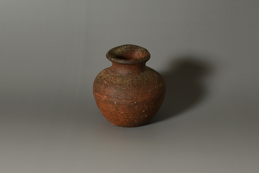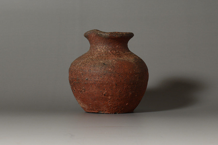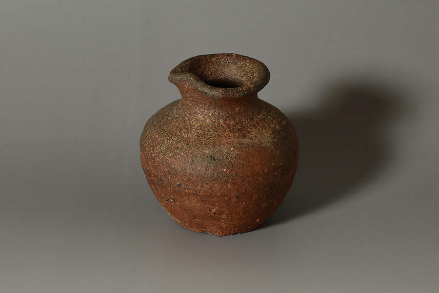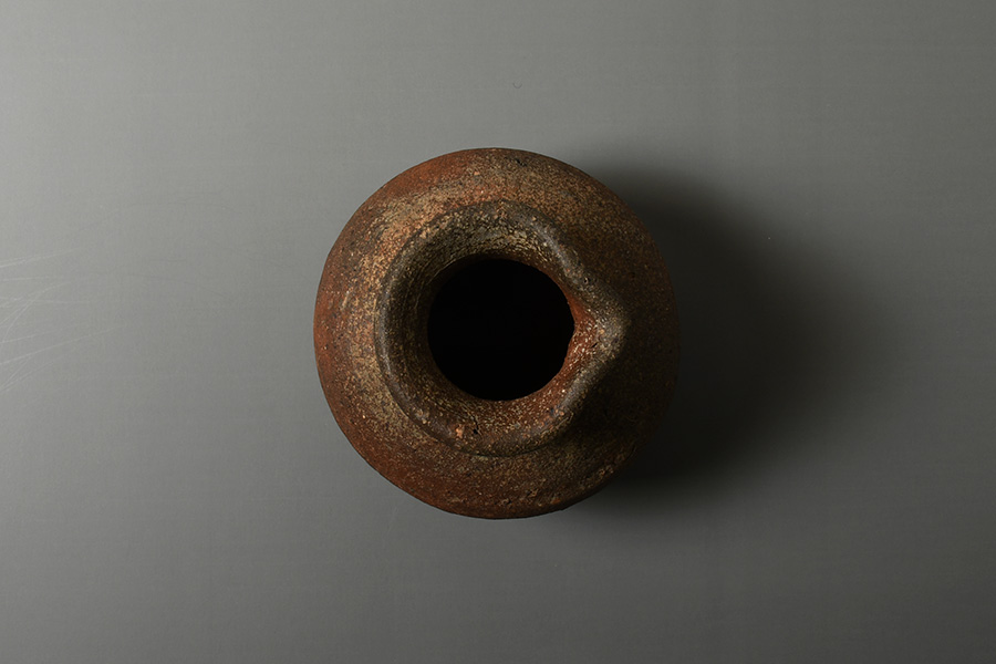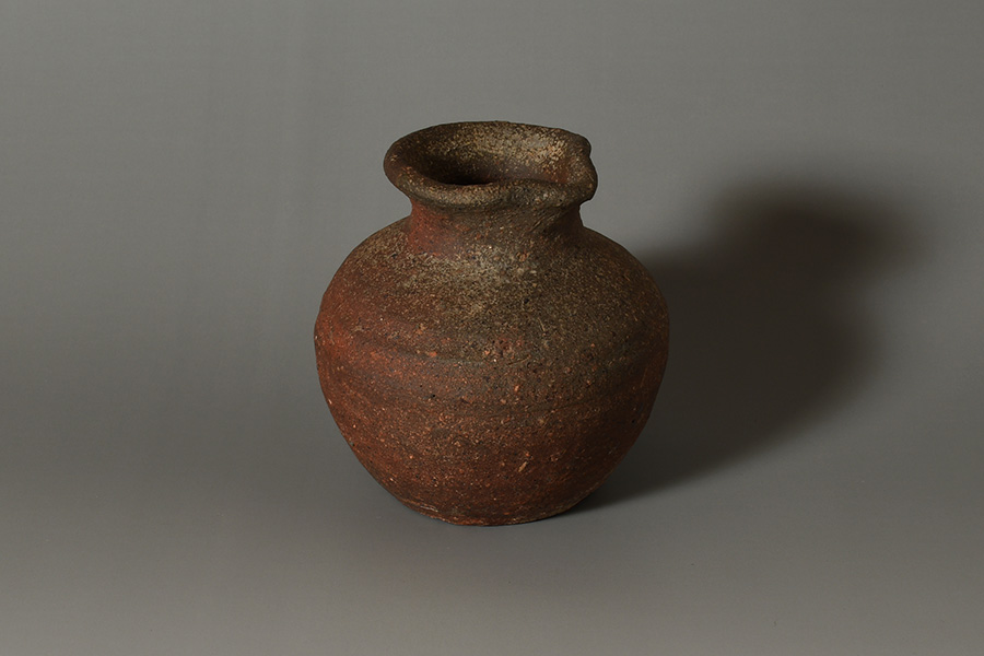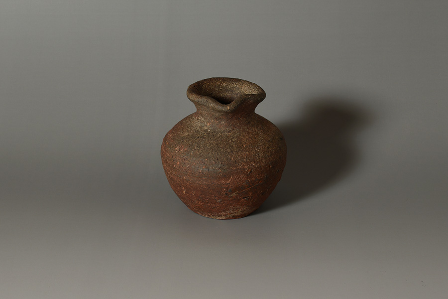 肩の張ったふくよかな胴に、引き締まった首が立ち上がり、口縁には鋭くも愛らしい「鳶口」が施されています。簡潔でありながらも力強い造形が印象的です。