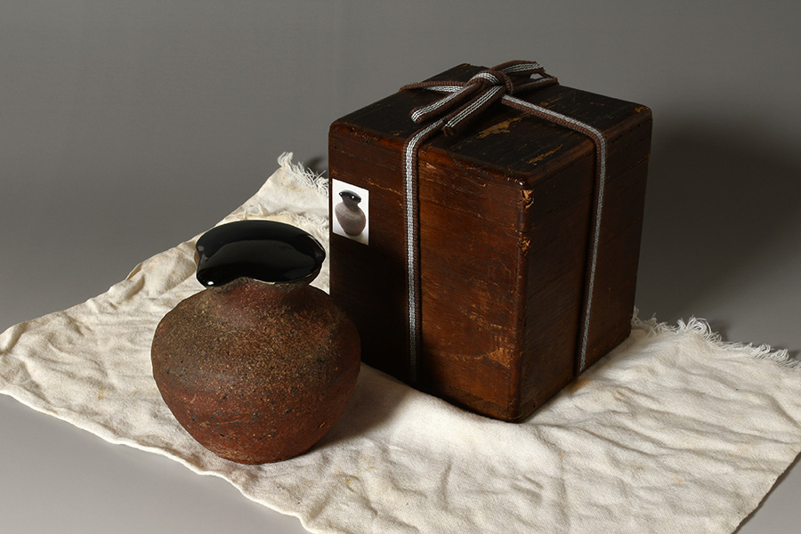 また、黒漆塗りの蓋が付属することから、かつて茶入としても使用されていたことがうかがえます。酒器としてのみならず、茶の湯の世界とも関わりを持った履歴は、本品にひと際奥行きある魅力を与えています。